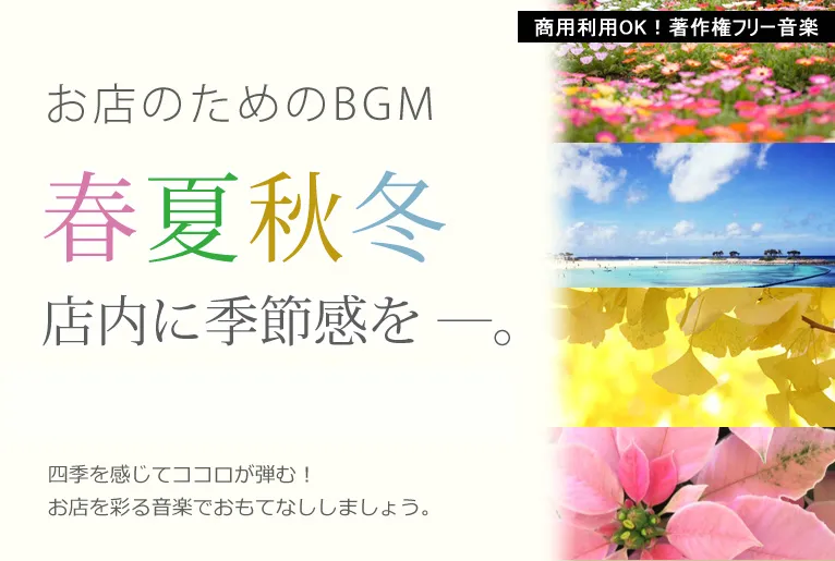 お店の空間に季節感をプラスしたい!という店舗様に、是非おすすめの4枚が誕生!イージーリスニングがベースの様々なテイストの音楽を季節ごとに1枚のCDにまとめました。店内がパッと華やぐ春と夏、しっとり優しく穏やかな秋と冬です。お客様もスタッフのみなさんも安心の著作権フリー音楽で四季を楽しみましょう!